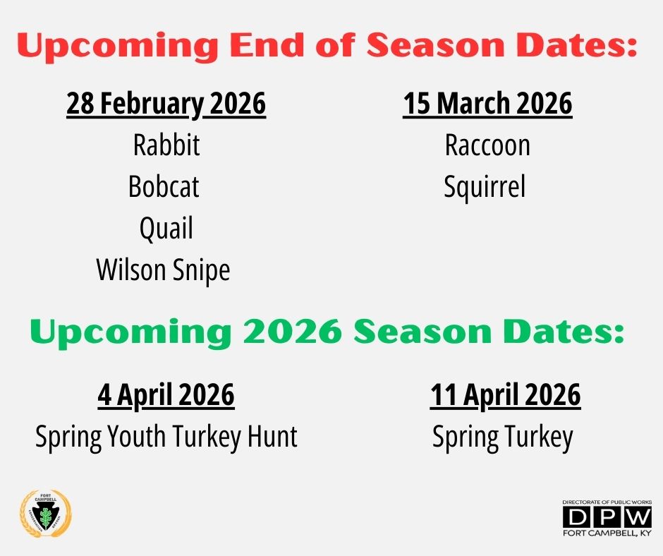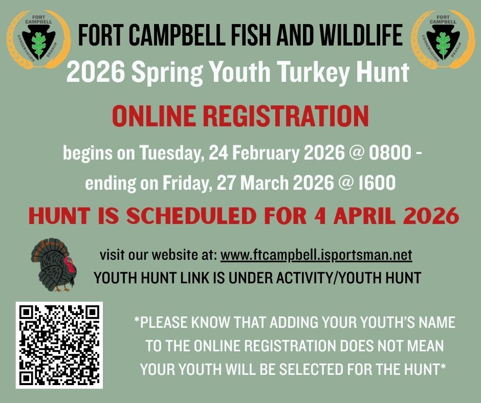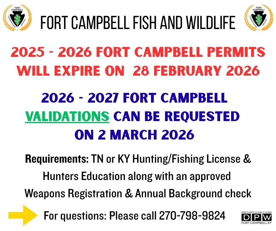 ANNOUNCEMENT: As part of the Army's initiative to streamline social media, Fort Campbell Fish and Wildlife Facebook page will be deleted as of February 27, 2026. To stay up-to-date on all installation news and events, please follow the OFFICIAL U.S. Army Fort Campbell social media pages. Going forward, all Alerts & news updated for iSportsman recreation can be found on the iSportsman homepage through the ALERT/NEWS LINK.